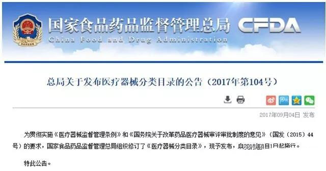 隨著醫(yī)療器械產(chǎn)業(yè)的快速發(fā)展,新技術(shù)、新產(chǎn)品的不斷涌現(xiàn),醫(yī)療器械分類體系已難以適應(yīng)產(chǎn)業(yè)發(fā)展和監(jiān)管工作的需要。近日,國家食品藥品監(jiān)督管理總局正式發(fā)布了最新修訂的《醫(yī)療器械分類目錄》,自2018年8月1日起施行。